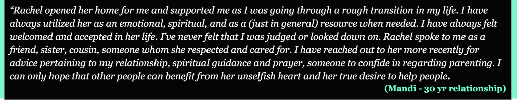 Thank you Rachel for your help and I would recommend her help to all. As a matter of fact I have already been recommending her to my family and friends.“